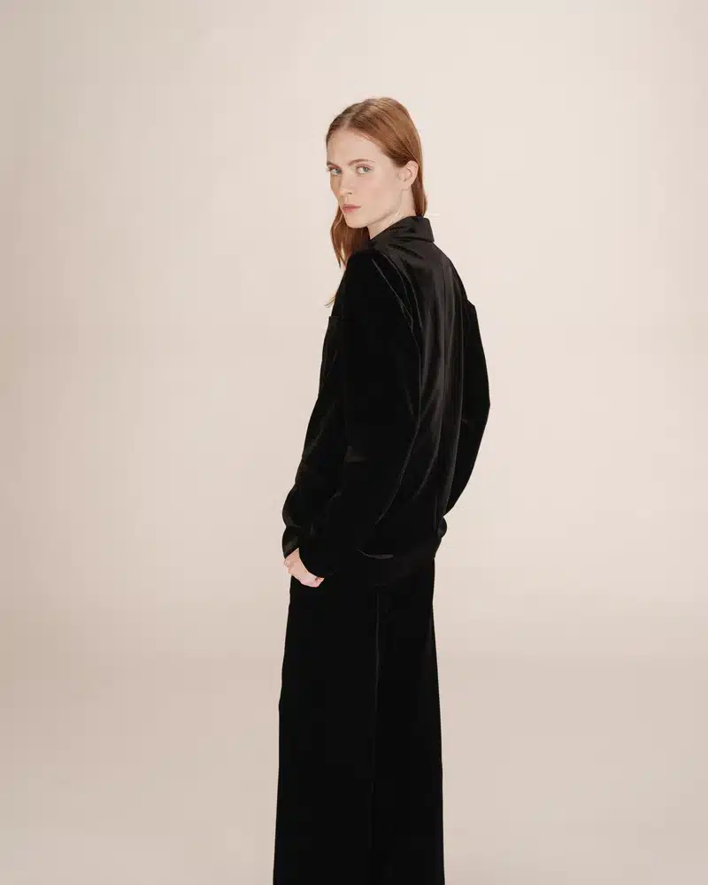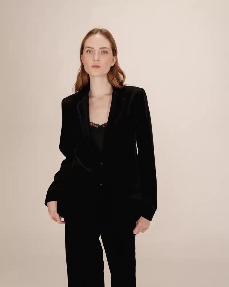 Completa el look: El blazer de manga larga TOFU combina a la perfección con el camisón de encaje TREFLE y el pantalón recto TIGER , creando un elegante y sofisticado conjunto de terciopelo inspirado en la moda masculina.