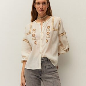 La blusa amplia VERSIGNY está confeccionada en popelina de algodón. El corte oversize y las mangas cortas aportan un look moderno y elegante. El cuello de camisa añade sofisticación, mientras que el escote en V aporta un toque femenino. Las líneas limpias y minimalistas de la blusa de manga corta VERSIGNY crean una silueta chic y desenfadada.