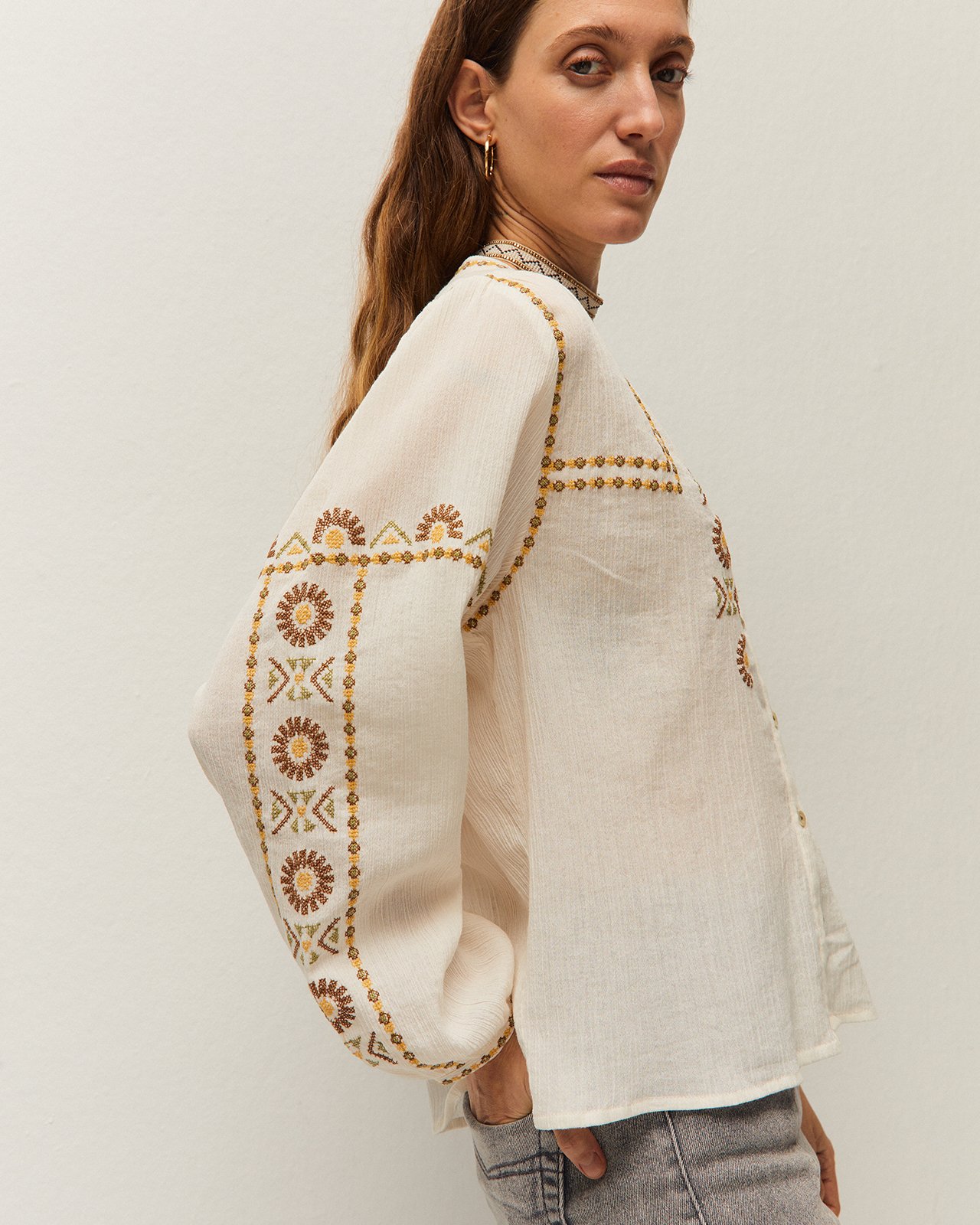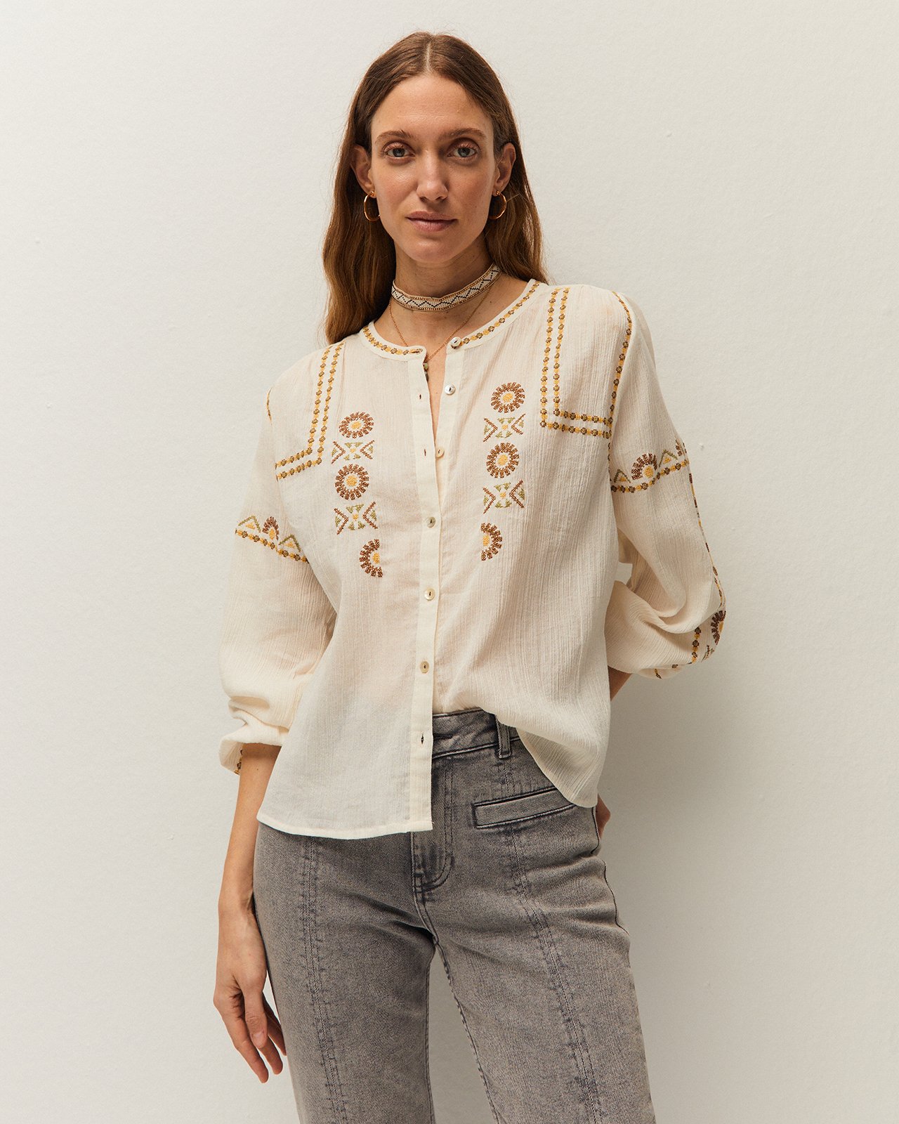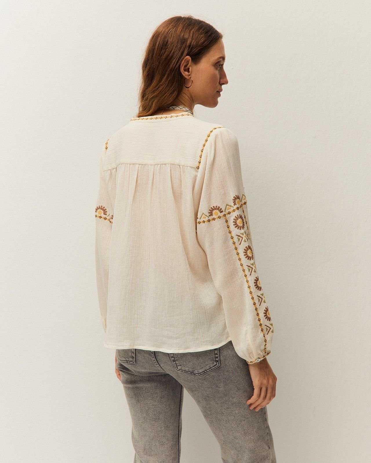Camisa con cuello pico y manga larga. Puños con botón. Detalle de bordados a contraste. Cierre con botones en el delantero. Prenda sostenible.