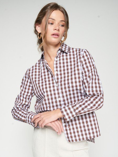 Camisa de cuadros vichy marrón y blanco con incrustaciones de pedrería multicolor distribuidas por toda la prenda. Cuello camisero, cierre con botones frontales y puños clásicos. Tejido de algodón con estructura firme. Corte recto ligeramente entallado.