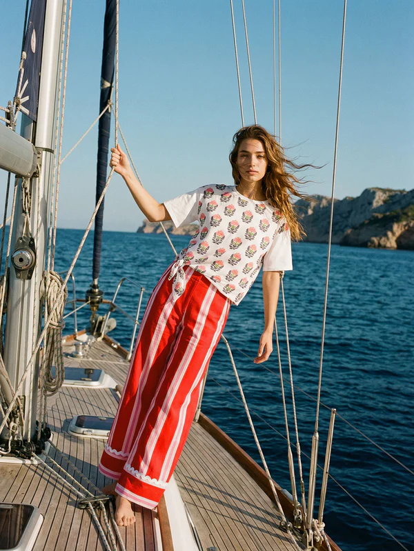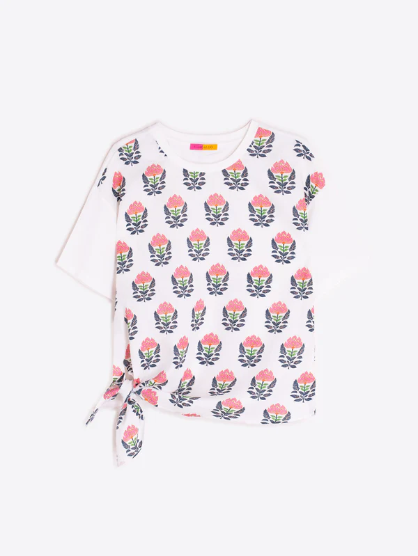 Camiseta blanca de manga corta con estampado en motivos florales. Nudo lateral, cuello redondo y corte recto.