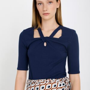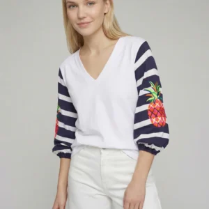 Camiseta blanca con cuello pico y mangas abullonadas en rayas marino y blanco. Bordado de piñas en mangas.