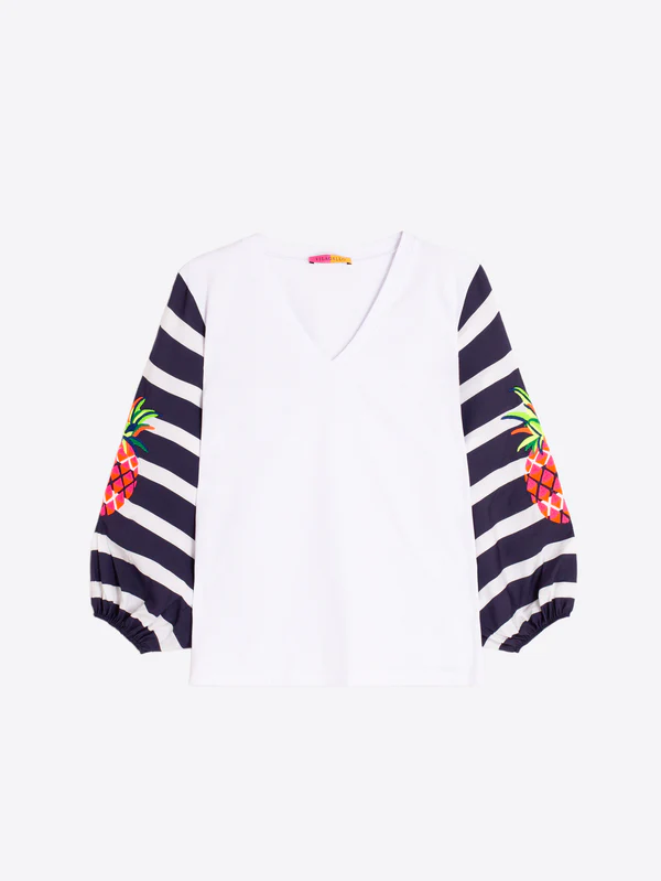 Camiseta blanca con cuello pico y mangas abullonadas en rayas marino y blanco. Bordado de piñas en mangas.