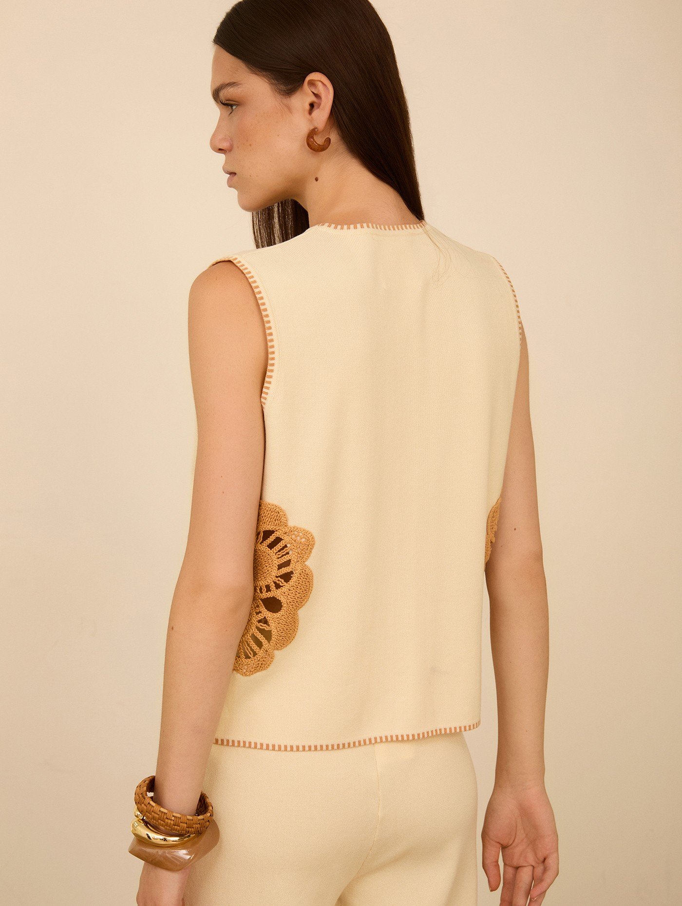 Chaleco de punto de viscosa con pieza de algodón al vacío a contraste. Cierre con lazo de punto.