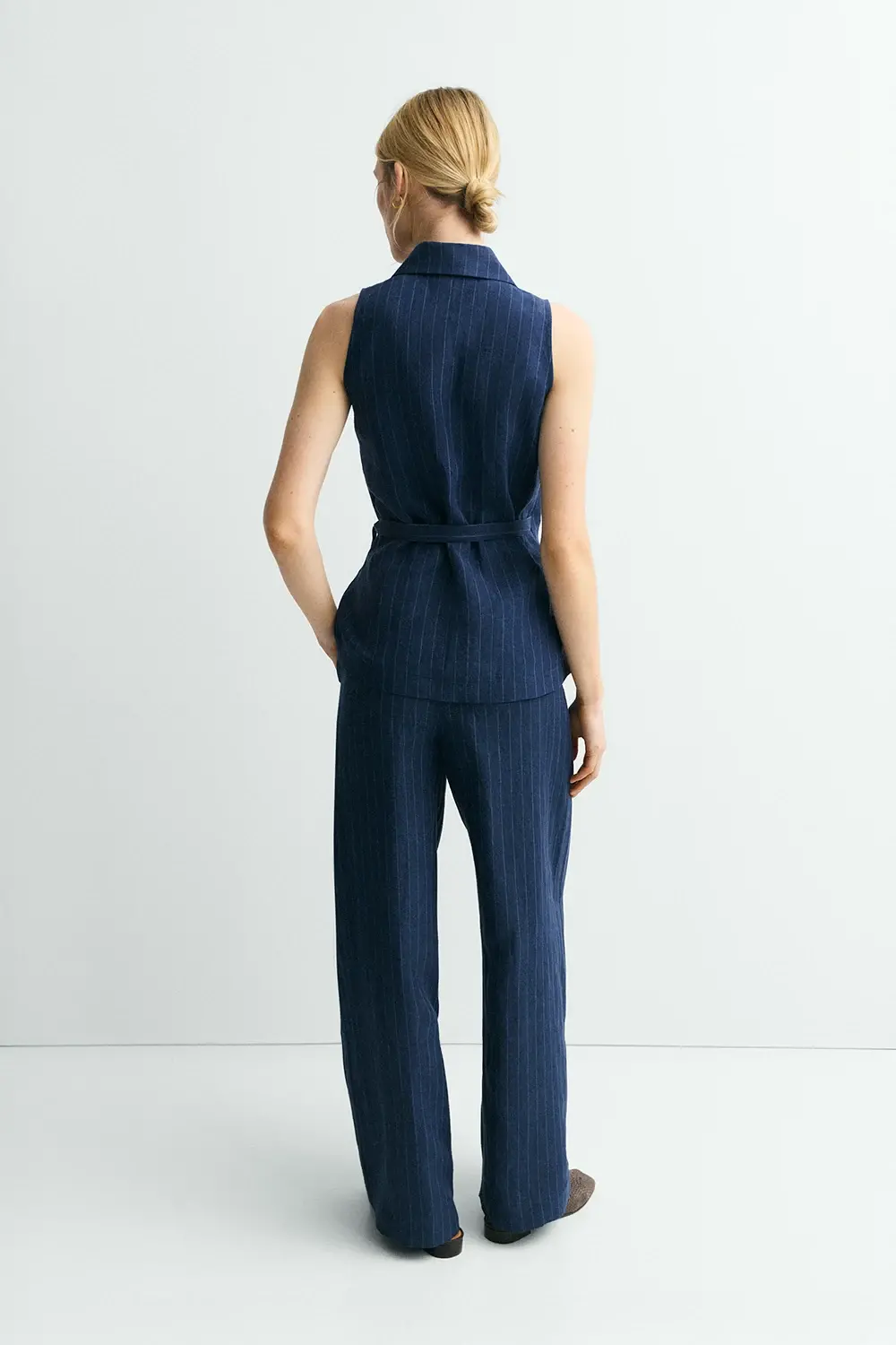 El top/chaleco Yukata es una prenda confeccionada en 100% lino, un tejido natural y ligero en tono azul marino con rayas.