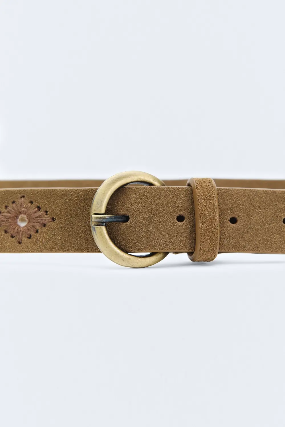 Cinturon de serraje. Hebilla dorada. Detalles bordados