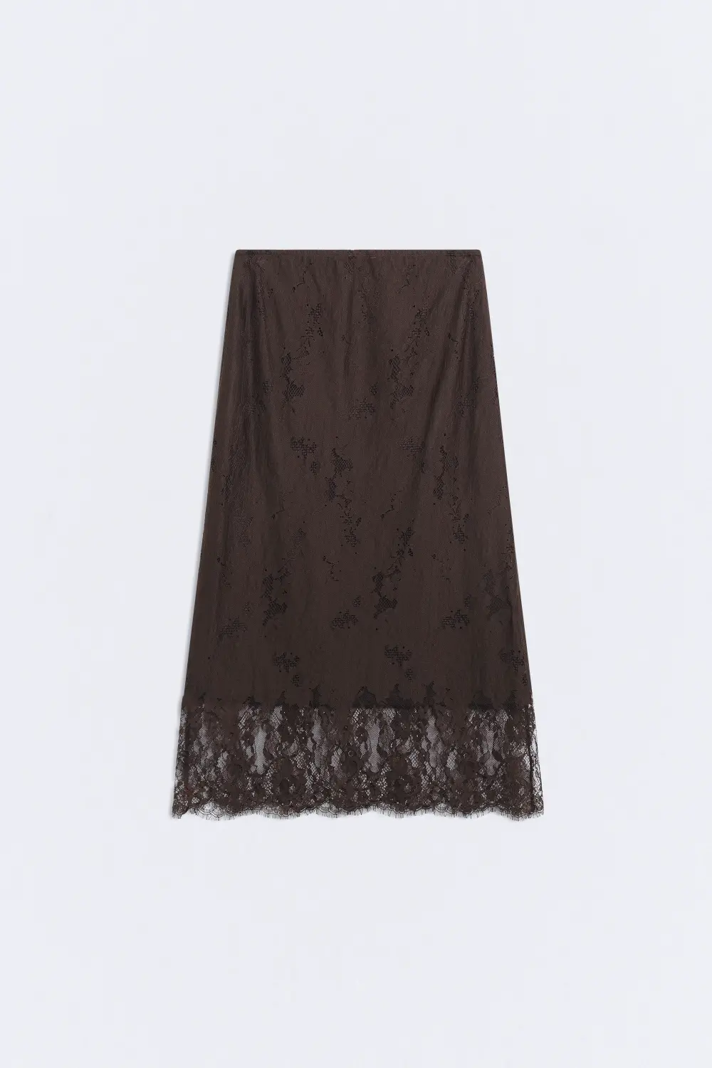 Falda midi con acabado lencero. Encaje calidad de blonda. Forro extraíble. Con goma en la cinturilla, sin cierre. Vestido mini a conjunto de venta por separado. En color chocolate.