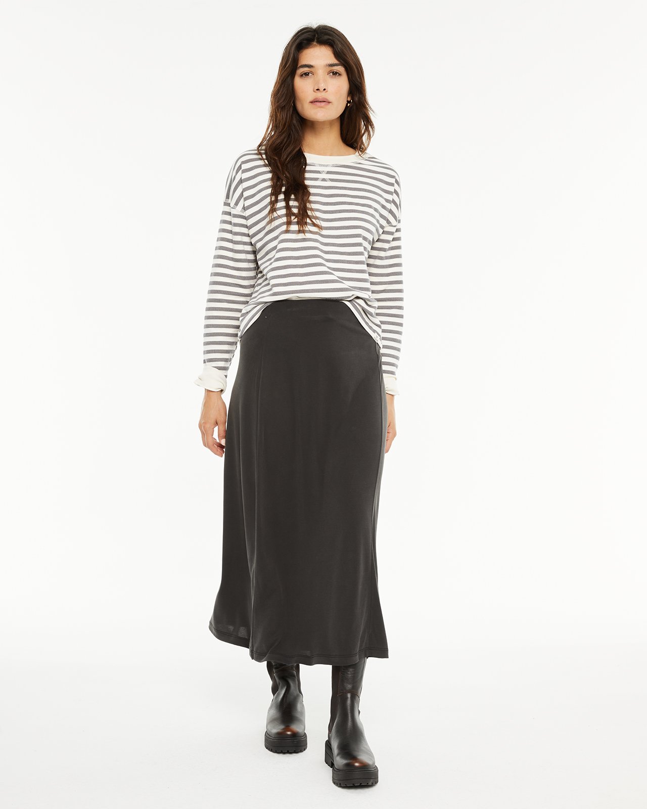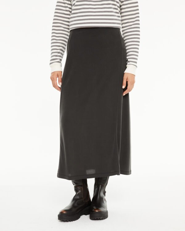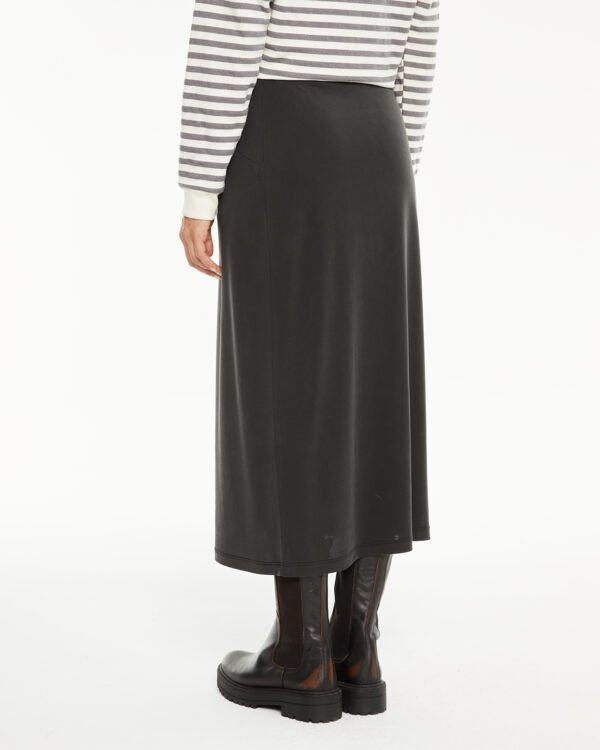 Falda midi de mujer, con goma en la cintura y detalle de costuras en el delantero. Prenda sostenible.