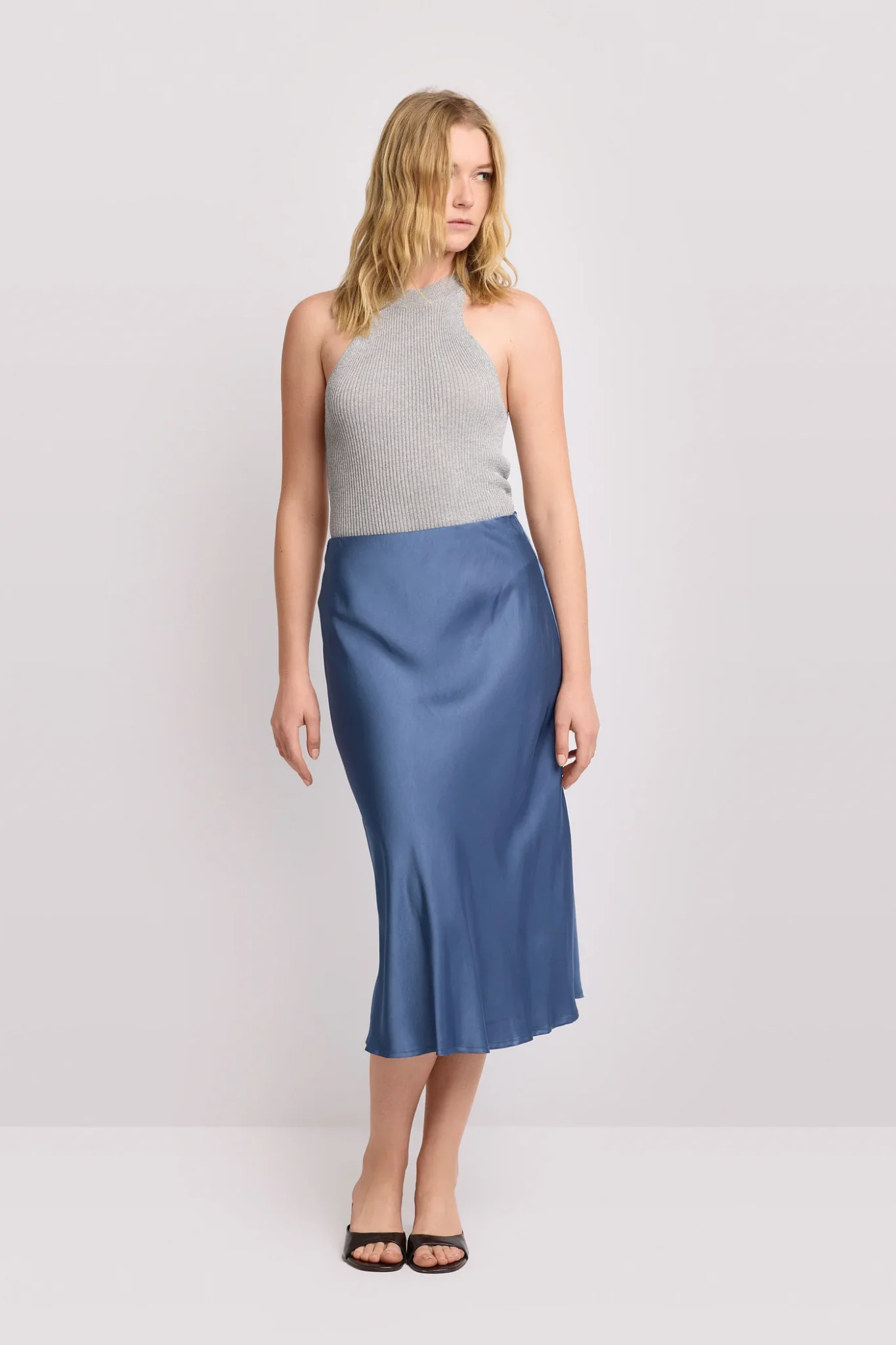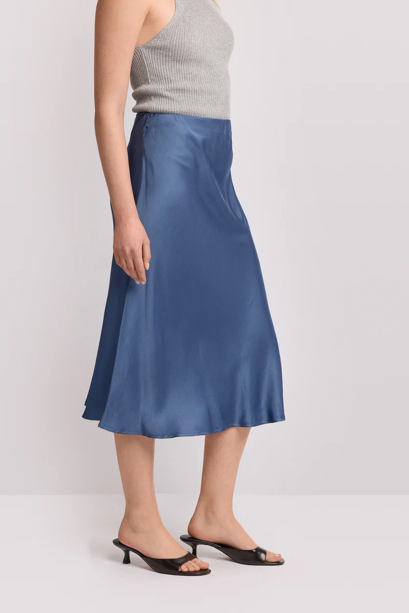Falda midi de corte fluido en tejido satinado, ideal para un evento de noche o un cóctel sofisticado.Diseño de tiro alto que realza la silueta con elegancia.Caída natural con movimiento femenino y acabado minimalista.