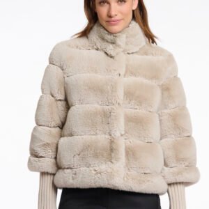 Chaqueta corta de piel sintética con un forro de gamuza sintética suave. Esta chaqueta tiene cuello alto, costuras cortadas en el pecho, cierre con botones a presión ocultos y bolsillos laterales invisibles. ¡El material de la chaqueta es tan suave que no podrás resistirte a ponértela!