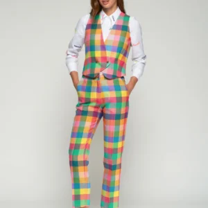 Pantalón de mujer de corte recto con estampado de cuadro gingham multicolor. Cintura media con cierre frontal de botón y cremallera.