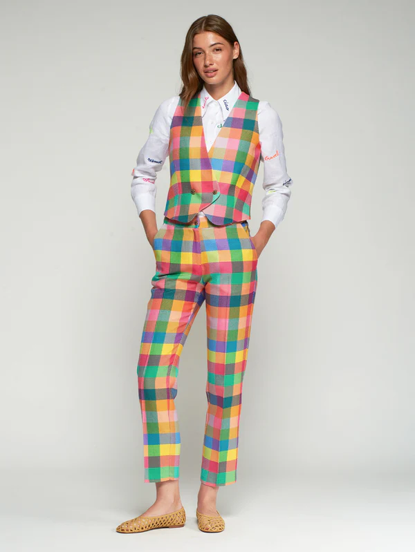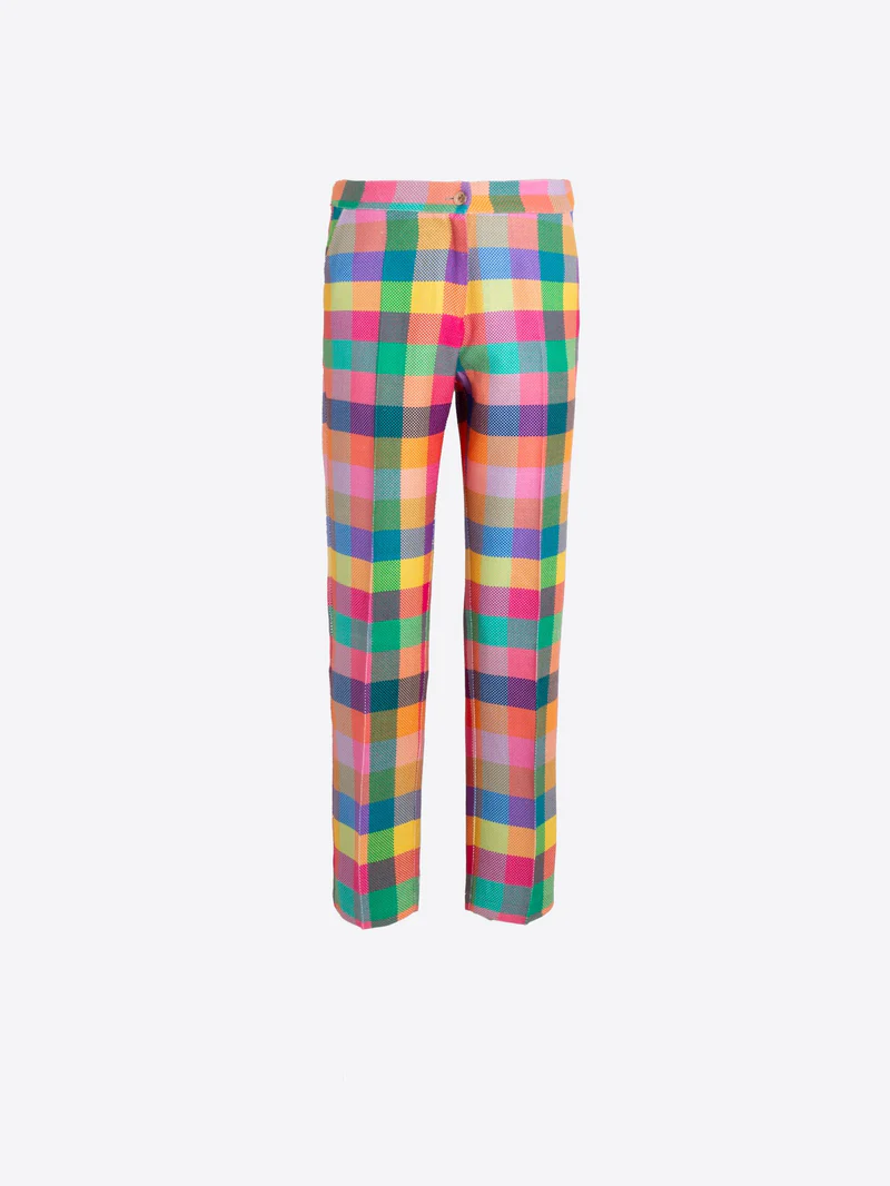 Pantalón de mujer de corte recto con estampado de cuadro gingham multicolor. Cintura media con cierre frontal de botón y cremallera.
