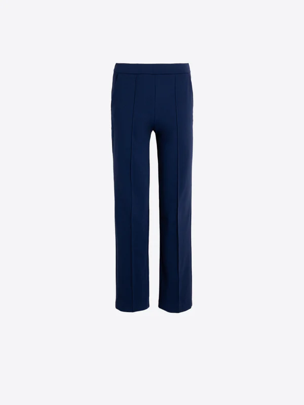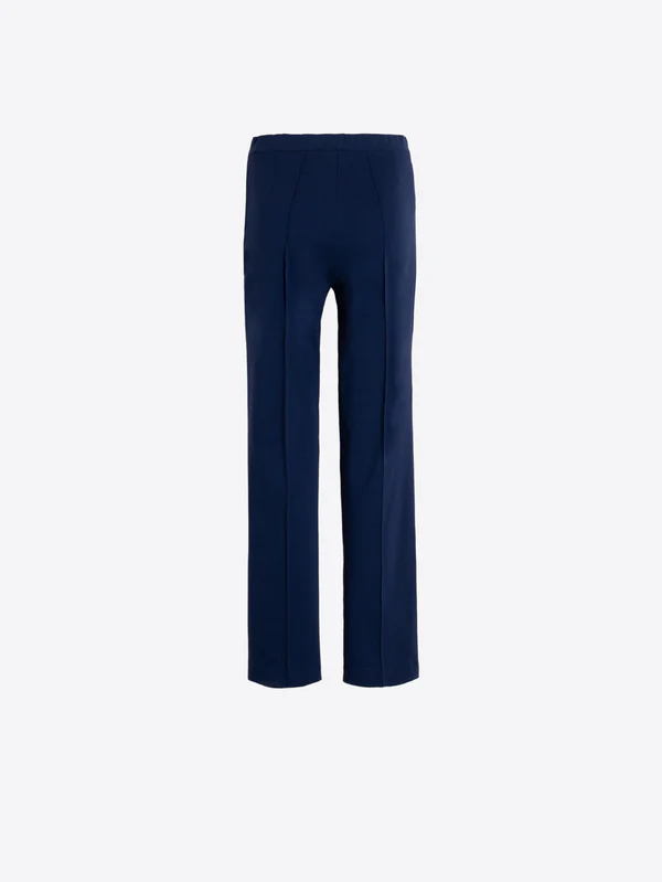 Pantalón marino de corte recto con cintura lisa y líneas verticales marcadas en delantero.