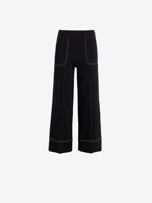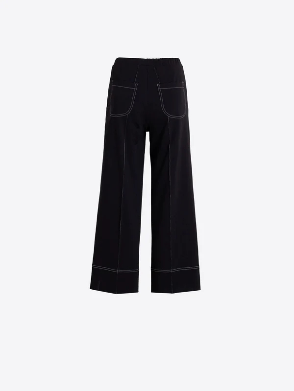 Pantalón negro de pernera ancha con costuras decorativas en contraste en delantero y bajo amplio estructurado. Lleva cintura elástica y bolsillos superiores.