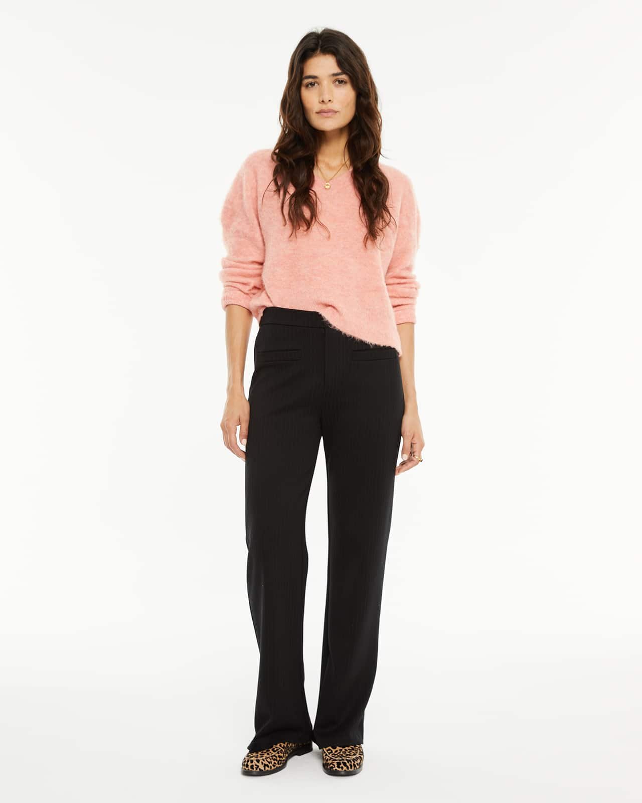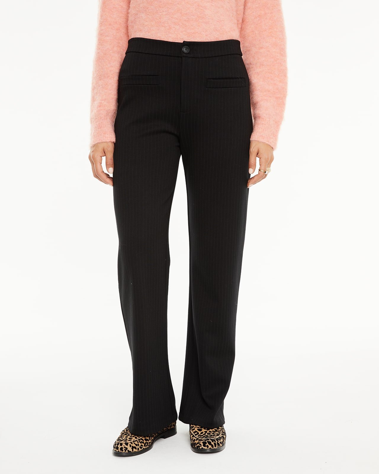 Pantalón acampanado de mujer con raya diplomática, bolsillos de vivo en la parte delantera y cierre con gancho.