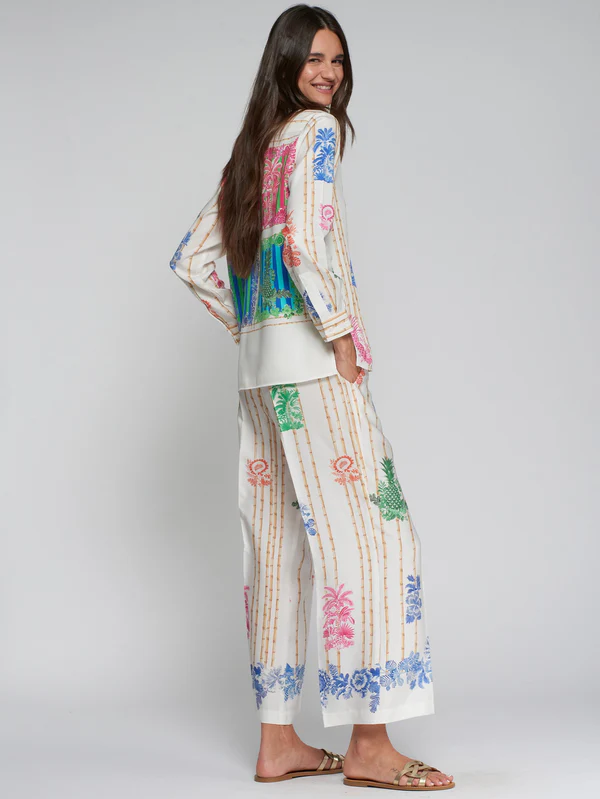 Pantalón de corte recto con estampado bambú sobre fondo crudo, combinado con motivos tropicales multicolor distribuidos en la prenda.