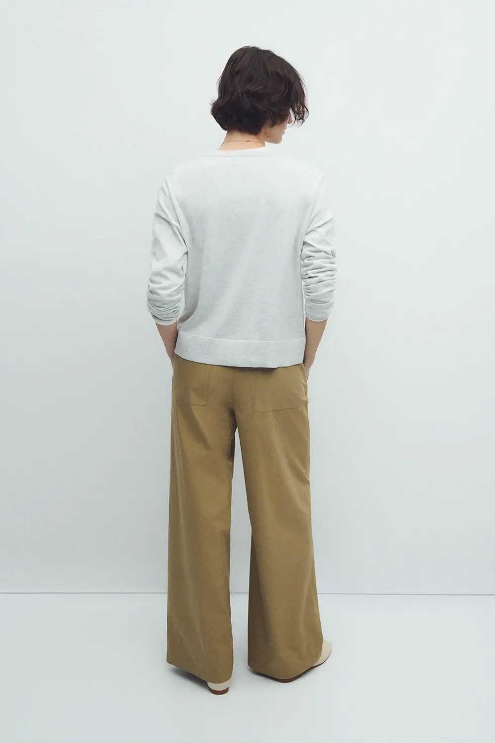 Pantalón largo de tiro alto en tejido 100% algodón BCI. Cinturilla con goma elástica trasera. Cierre de botón y cremallera. Detalle de pinzas en cintura. Fitting de pierna ancha. En color oliva.