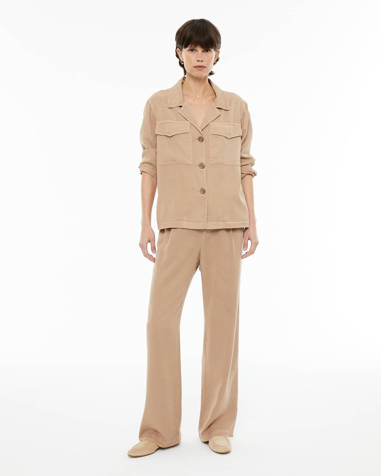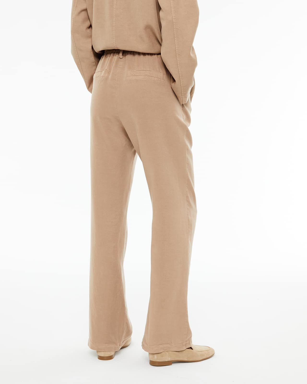 Pantalón fluido de mujer, con goma en la espalda, bolsillos tipo vivo y cierre con botón. Prenda sostenible.