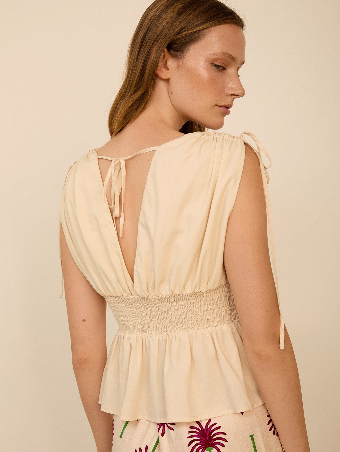 Top de algodón-viscosa con flores en relieve. Escote pico. Smock elástico en la espalda.