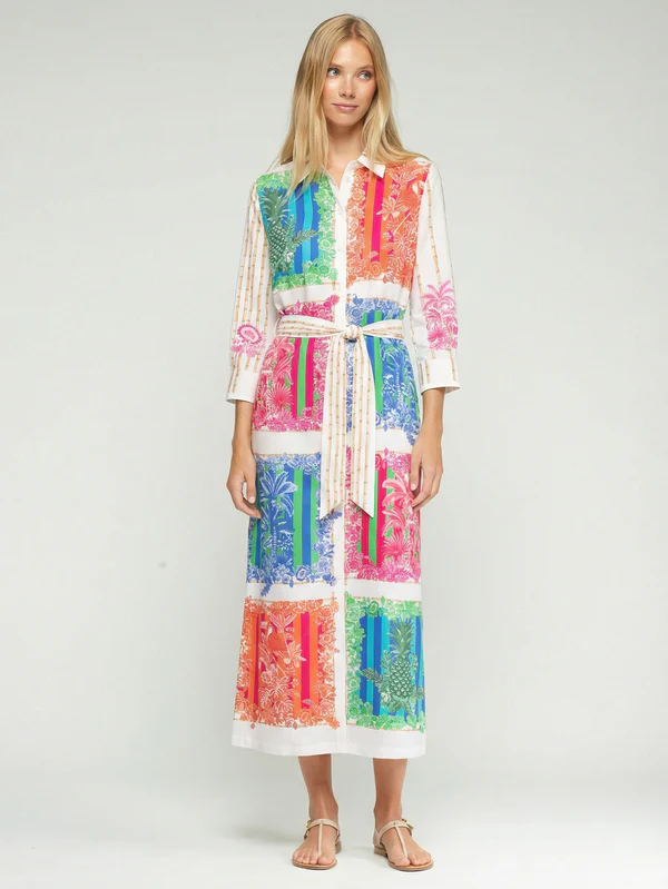 Vestido largo de corte camisero con estampado bambú multicolor. Cuello camisero clásico y cierre frontal con botones. Manga 3/4 con puño camisero. Cinturón a conjunto extraíble. Bajo recto con largo midi.