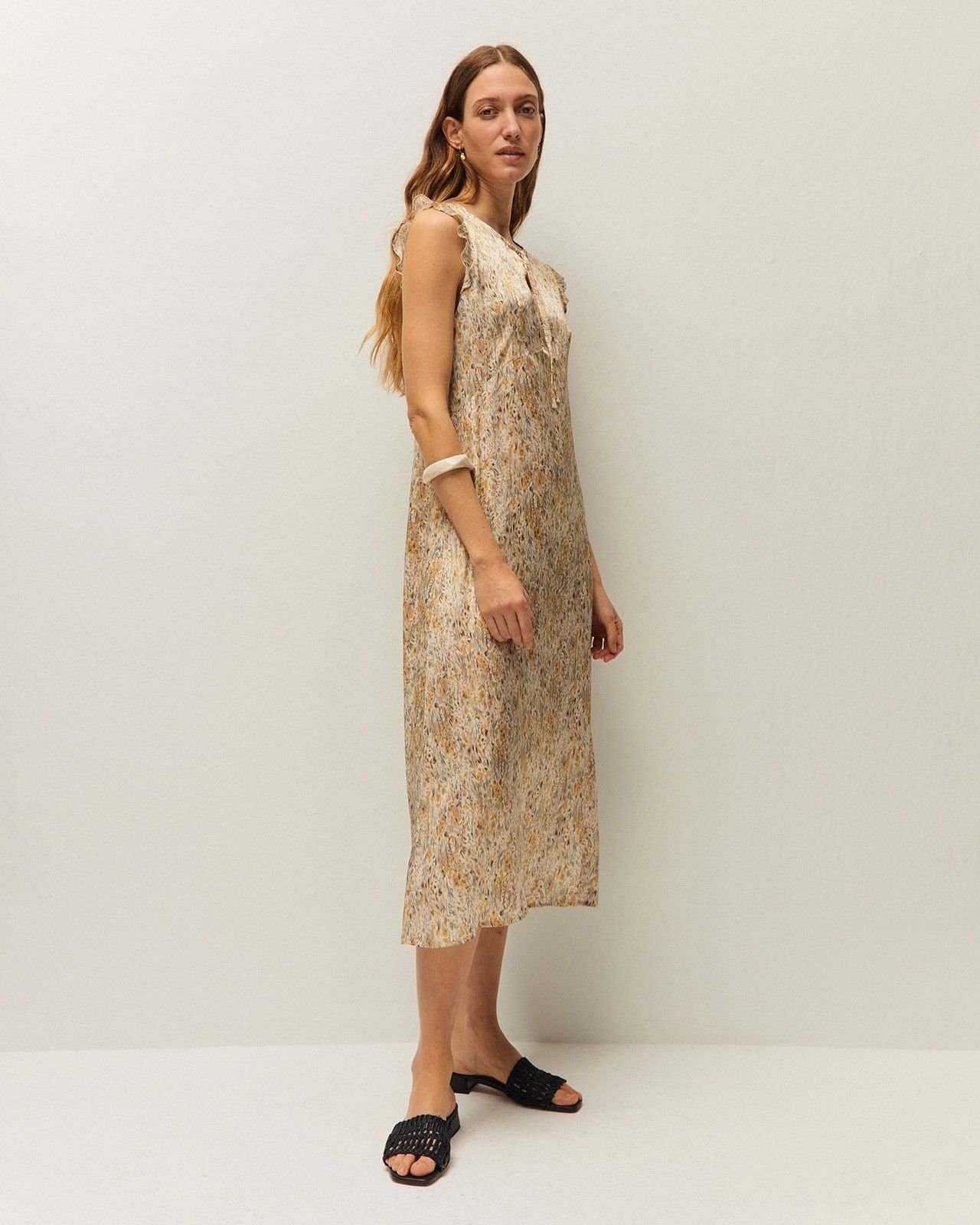 Vestido largo con cuello pico y lazada. Manga acabada en volante. Estampado floral. Prenda sostenible.