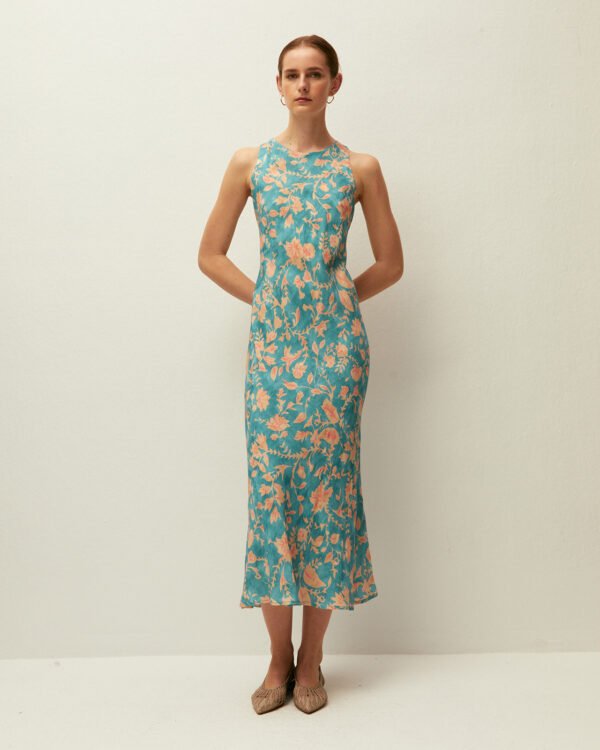 Vestido largo con cuello redondo cerrado y tirantes. Pinzas delanteras y estampado floral. Prenda sostenible.