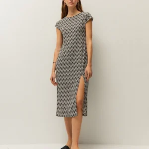 Vestido largo estampado con cuello redondo y manga corta. Detalle de abertura en el bajo. Prenda sostenible.