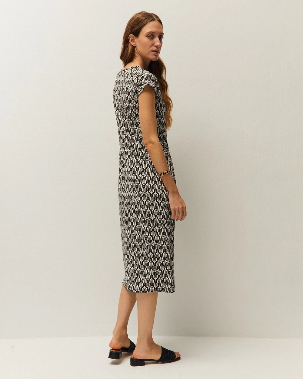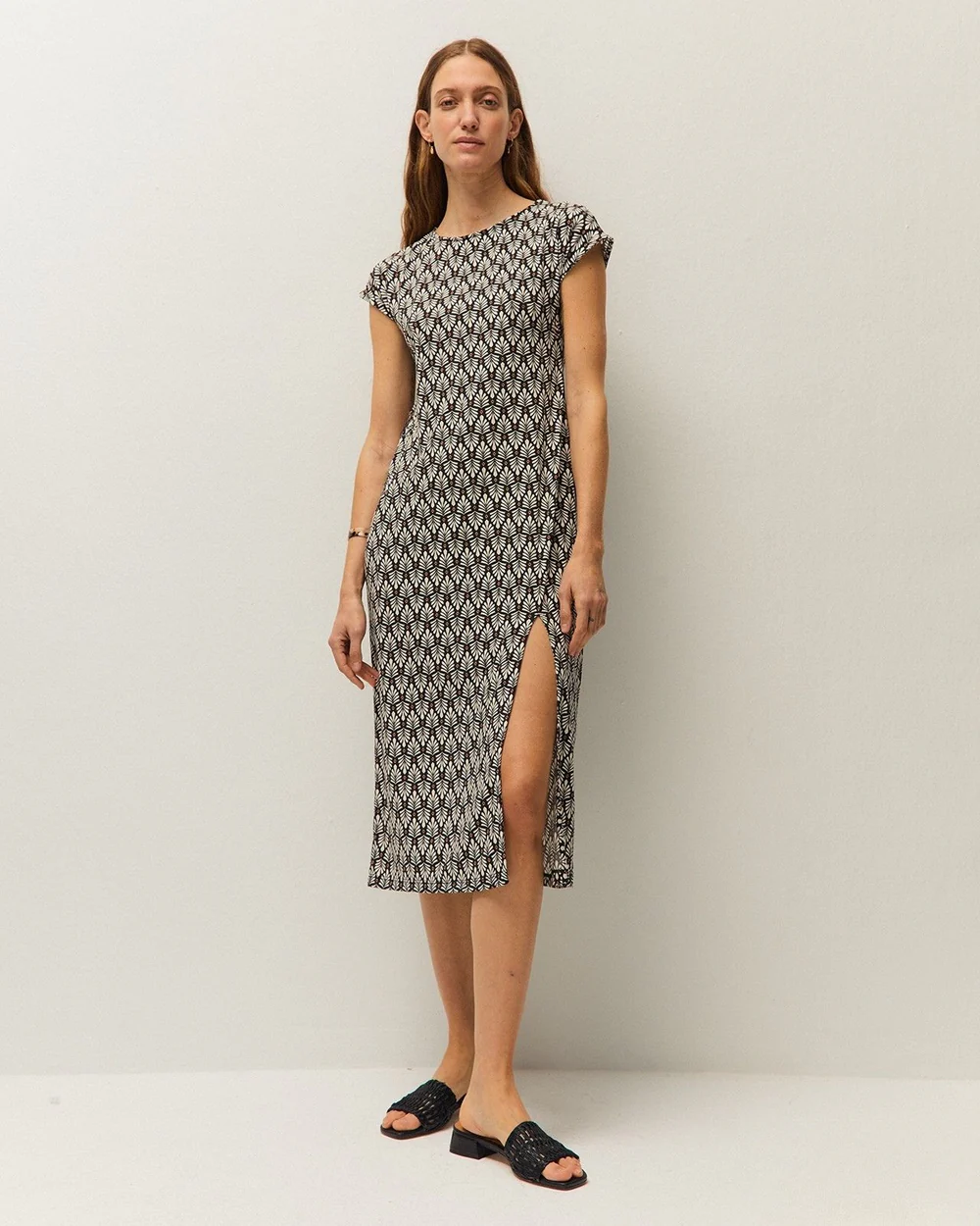Vestido largo estampado con cuello redondo y manga corta. Detalle de abertura en el bajo. Prenda sostenible.
