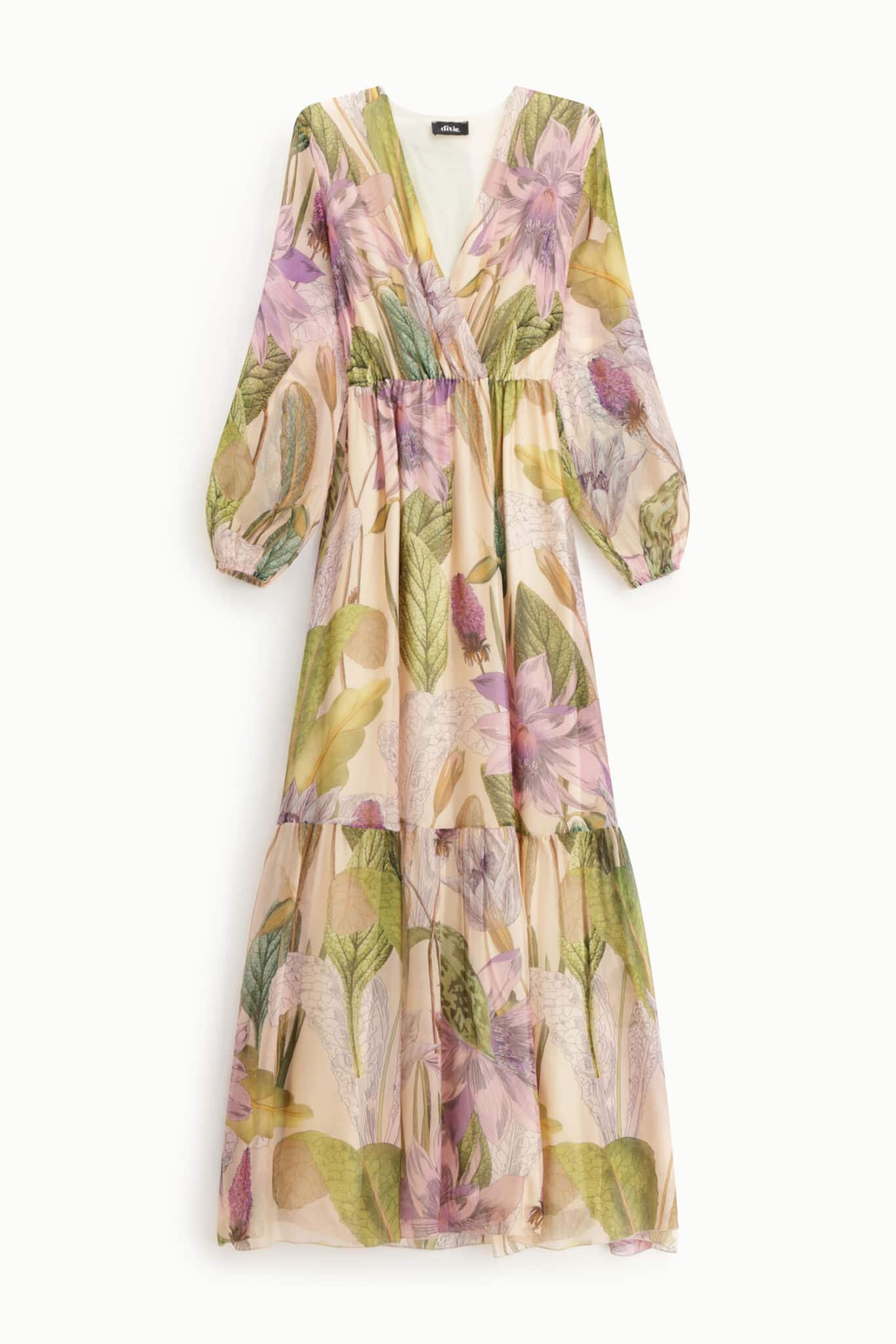 Vestido largo estampado floral escote en v mangas 3/4. Déjate envolver por este vestido largo con amplio vuelo y estampado floral. El escote en v estiliza y las mangas 3/4 aportan comodidad. La cintura fruncida realza la figura, ideal para lucir fresca y especial en tu día a día con un toque femenino y delicado.