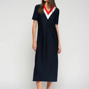 Vestido largo de corte recto en color negro. Diseño con escote en pico pronunciado decorado con bandas en contraste blanco y rojo.