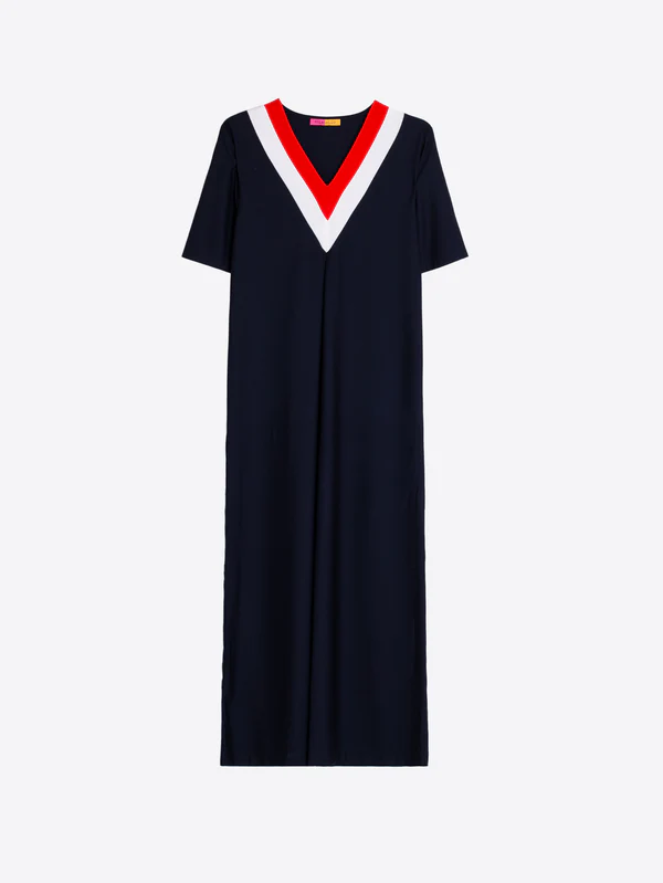 Vestido largo de corte recto en color negro. Diseño con escote en pico pronunciado decorado con bandas en contraste blanco y rojo.