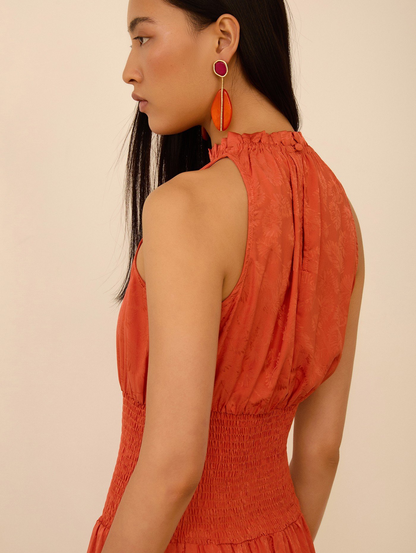 Vestido largo en tejido satinado con jacquard floral. Cintura con smock elástico.