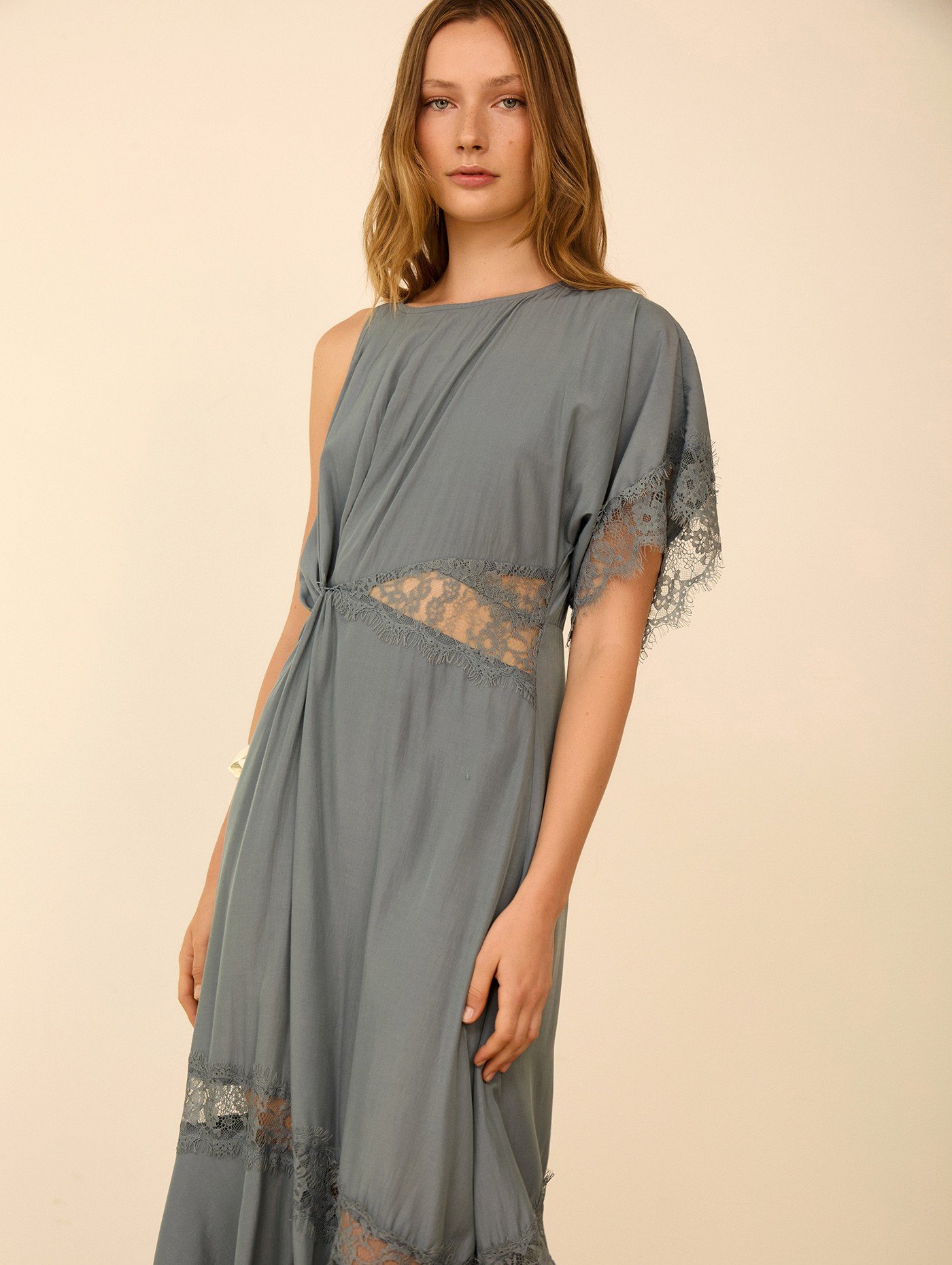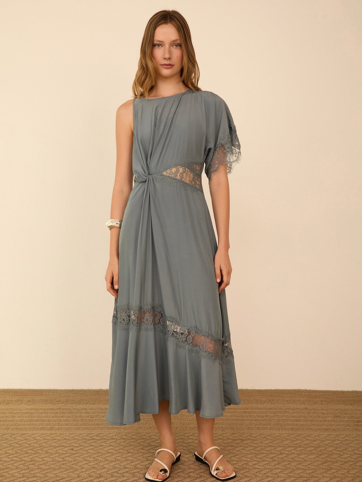 Vestido midi en tejido satinado combinado con encajes a tono. Mangas asimétricas. Encaje transparente en cintura. Cremallera invisible en la espalda.